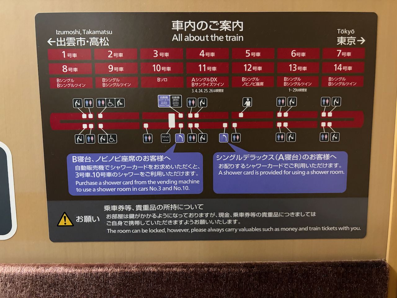 夜の9時50分に東京駅を出発し、翌朝10時に出雲駅に着くというスケジュール。
